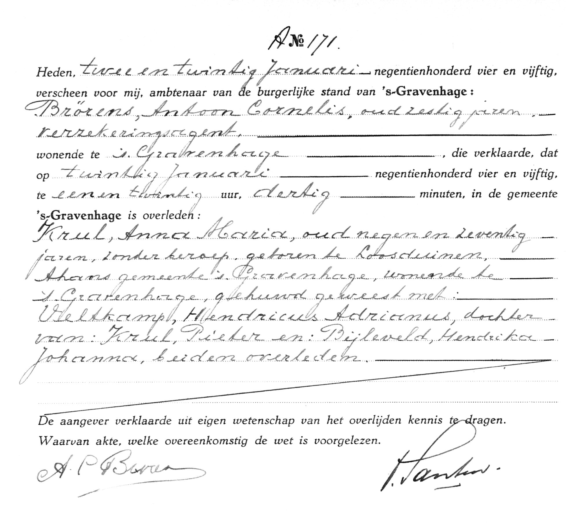 -Aangifte overlijden vr 22 jan 1954; BS ’s Gravenhage, Akte A 171
