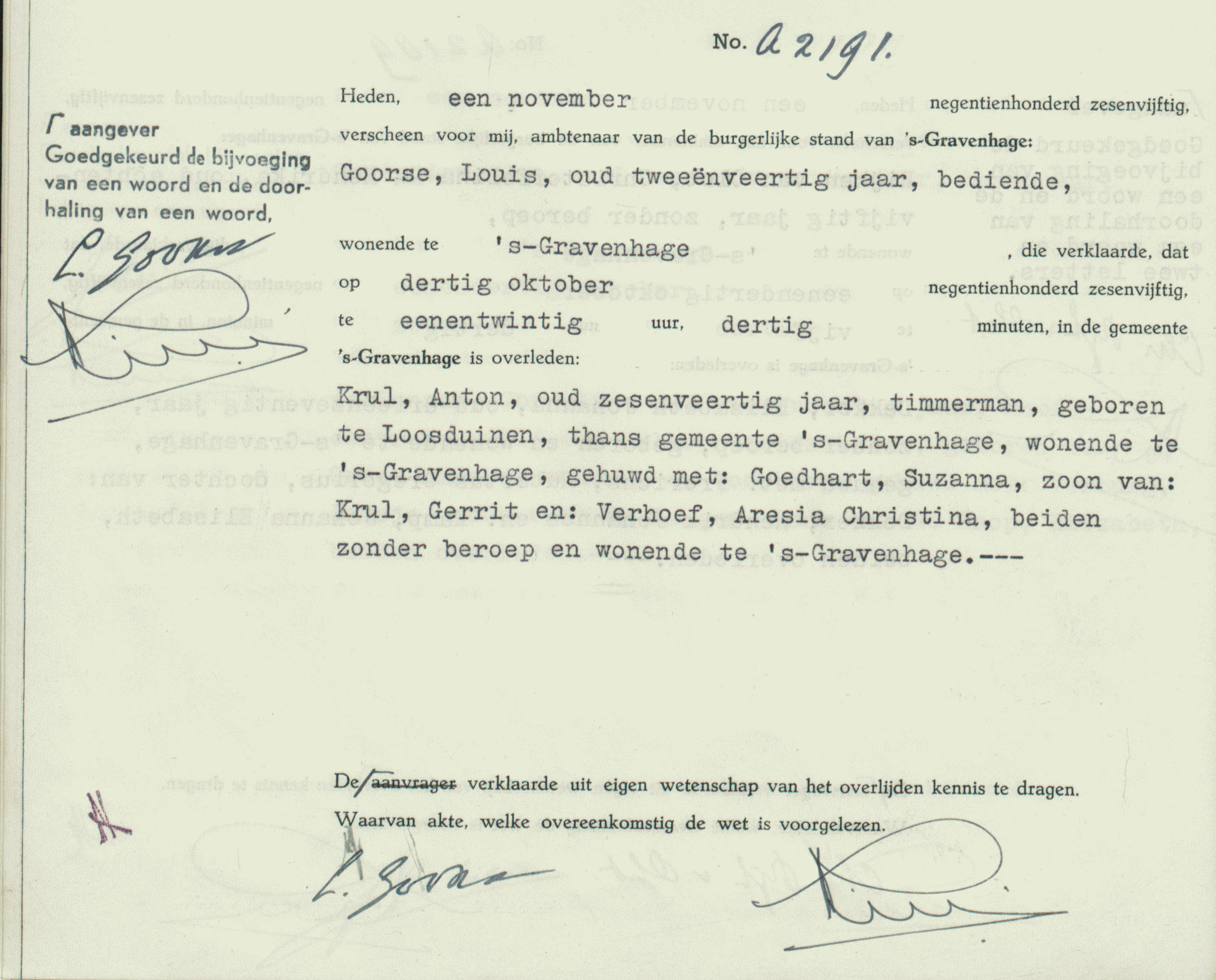 do 1 nov 1956; BS ’s Gravenhage, Akte A 2191