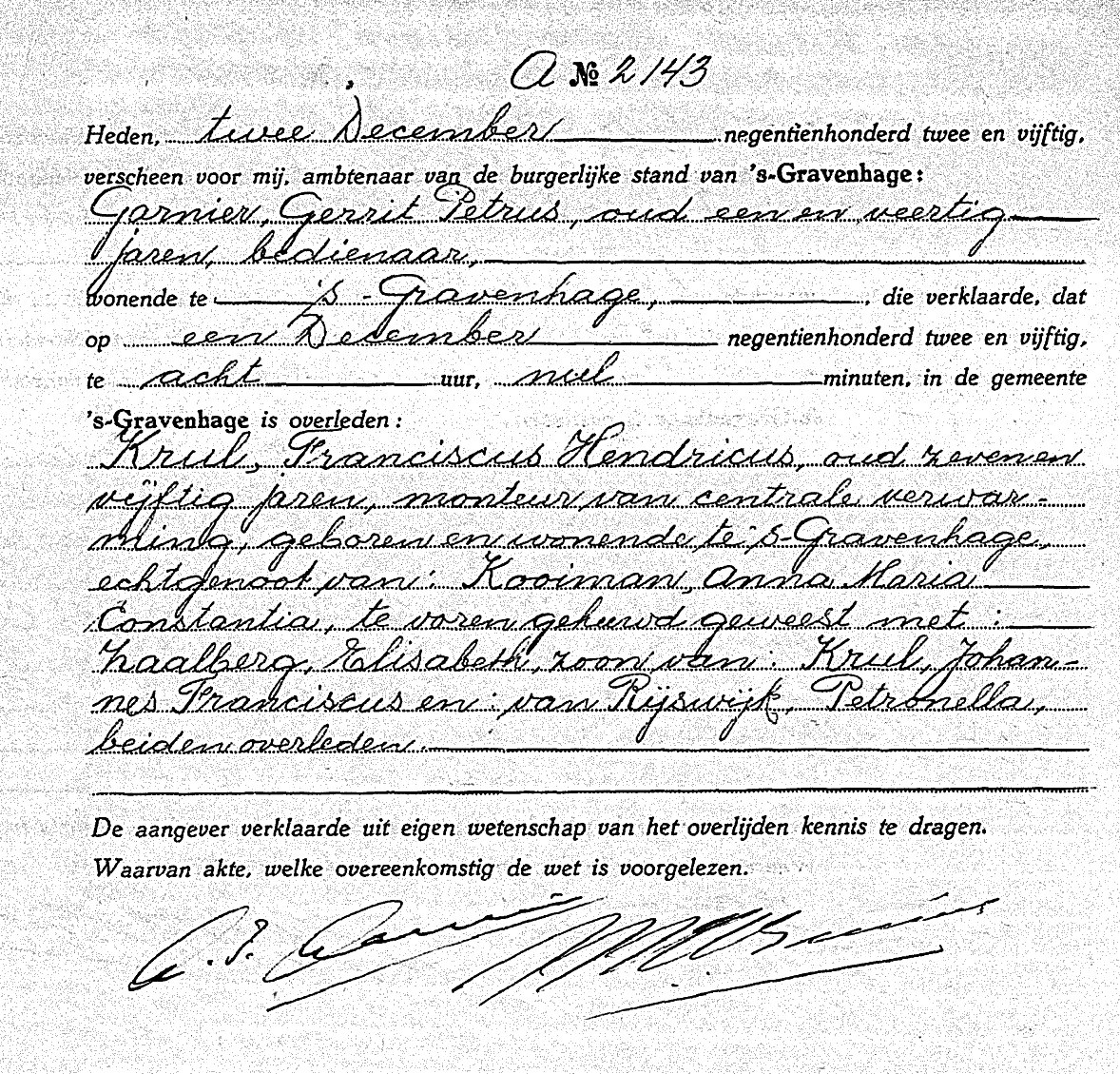 -Aangifte overlijden di 2 dec 1952; BS ’s Gravenhage, Akte A 2143