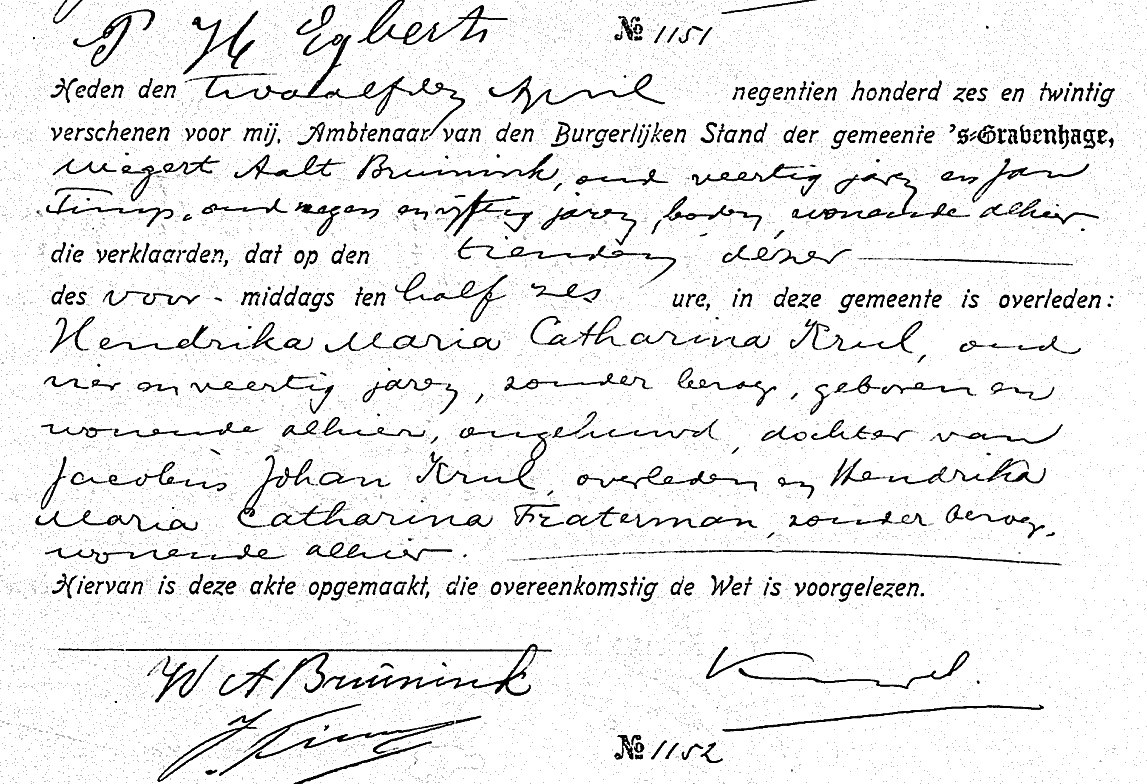 -Aangifte overlijden ma 12 apr 1926; BS ’s Gravenhage, Akte 1151