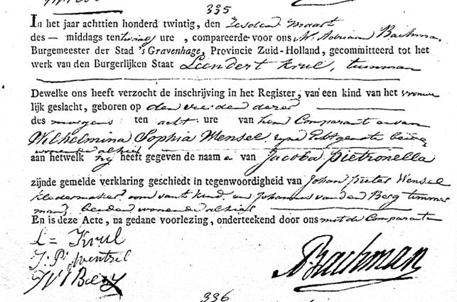 -Aangifte geboorte ma 6 mrt 1820; BS ’s Gravenhage, Akte 335