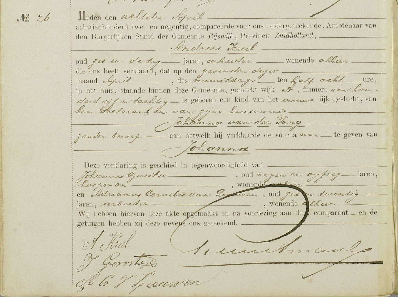 -Aangifte geboorte vr 8 apr 1892; BS Rijswijk, Akte 26