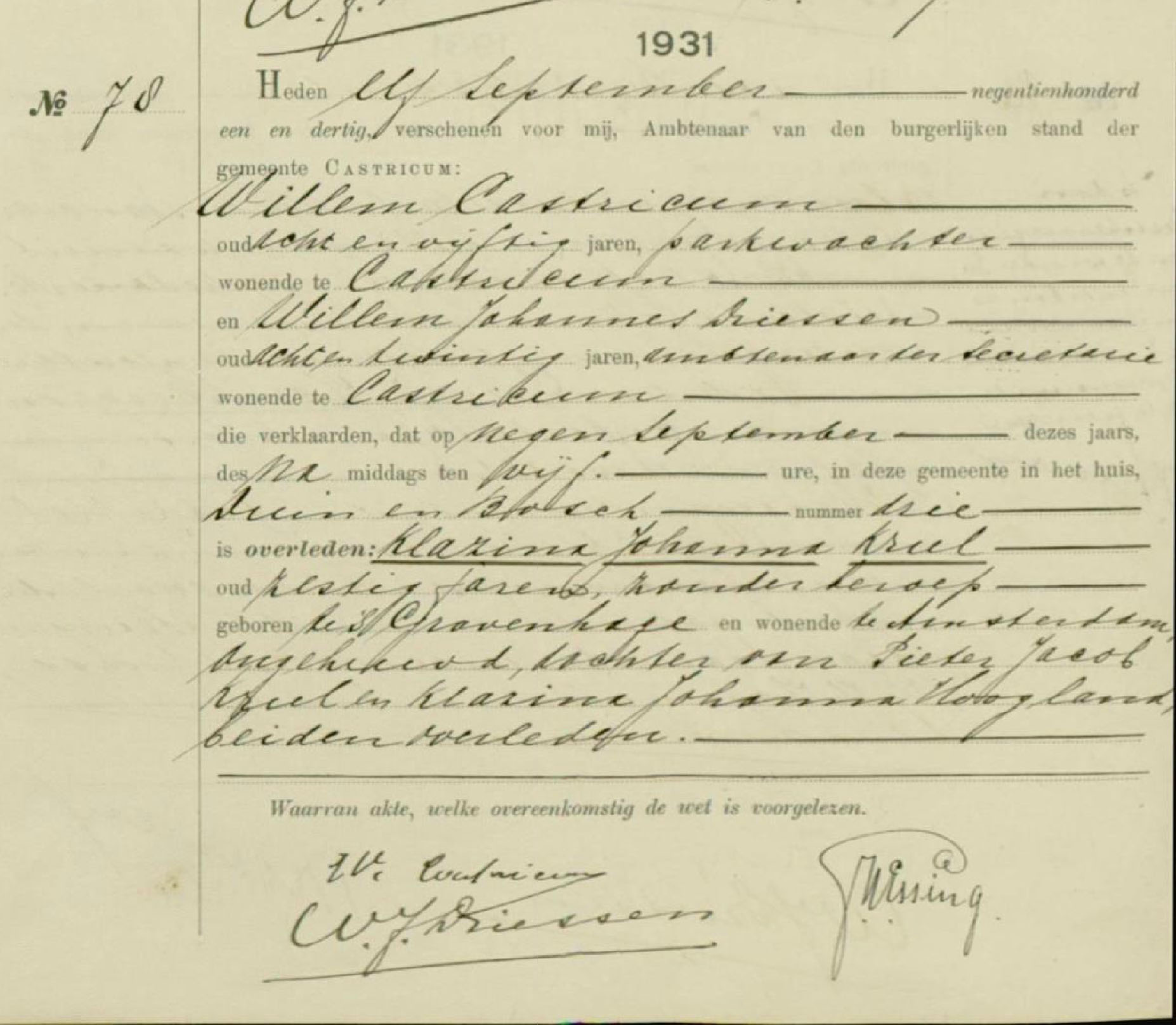 | -Geboorte | BS ’s Gravenhage, Akte A 1902 | | -Aangifte overlijden | vr 11 sept 1931; Noord-Hollands Archief, Akte 78 |