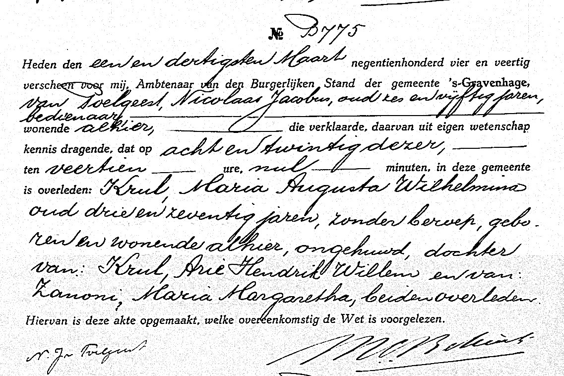 | -Geboorte | Cornelia Petronella Krul | | -Aangifte overlijden | vr 31 mrt 1944; BS ’s Gravenhage, Akte B 775 |