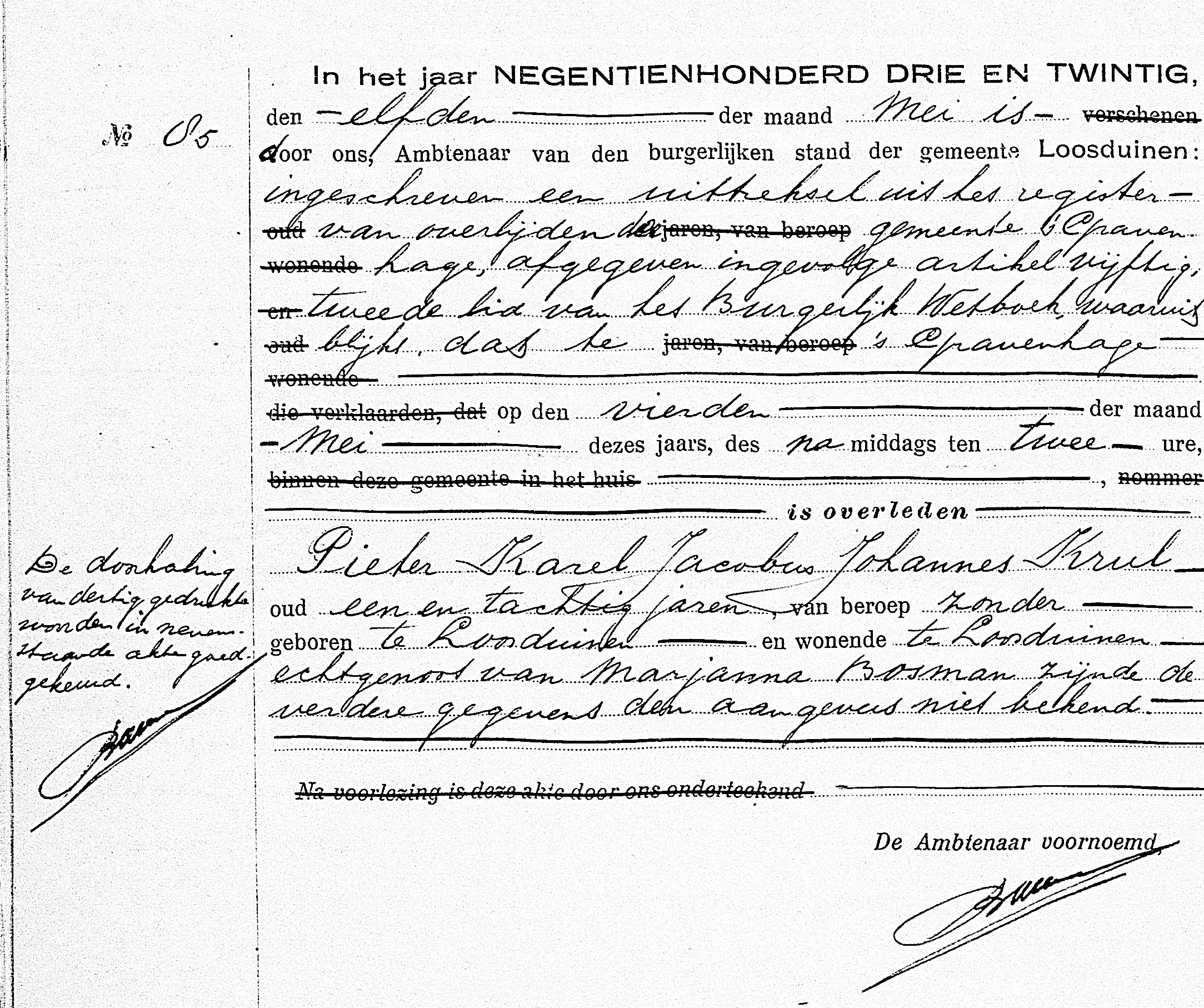 -Aangifte overlijden vr 11 mei 1923; BS Loosduinen, Akte 85, BS ’s Gravenhage, Akte 1465
