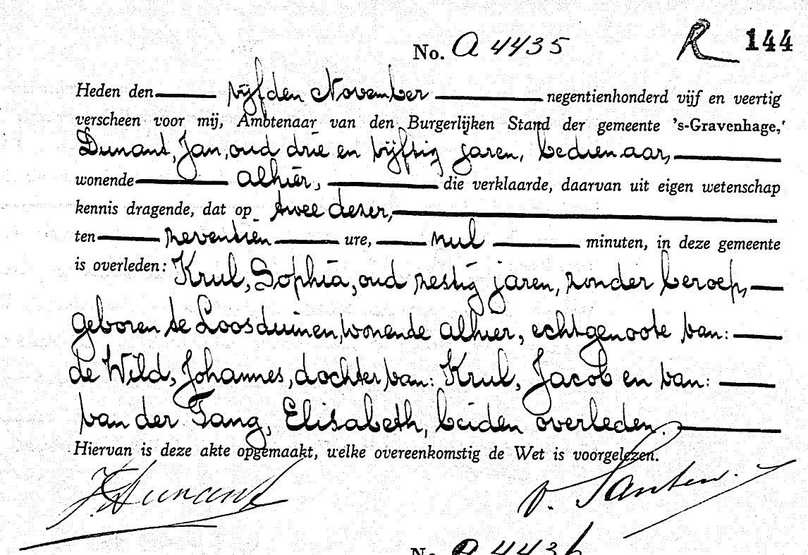 -Aangifte overlijden ma 5 nov 1945; BS ’s Gravenhage, Akte 4435